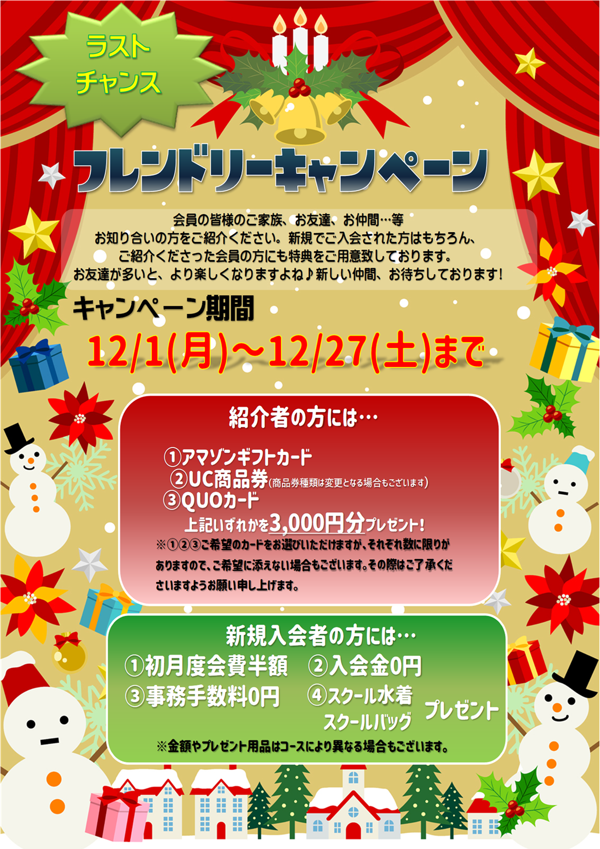 チラシ(表面)【フレンドリー(紹介)キャンペーン】開催中! ☆ご家族・お友達をご紹介ください!入会者様・紹介者様それぞれに特典をご用意しております!! ☆1回無料でお試しできる体験会も実施中! ☆他スクール・他クラブから転入を希望される方には特別特典をご用意しております♪お気軽にお問い合わせください! 【入会応援キャンペーン】も開催中! ※12月休館日:29日(月)~31日(水) ※1月休館日:1日(木)~4日(日)、12日(月祝) 新年は5日(月)より営業します♬ プログラムご案内